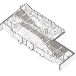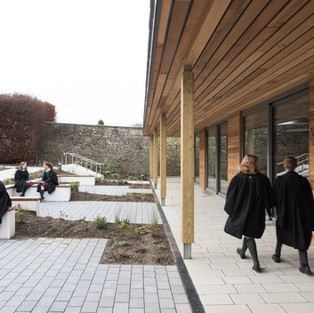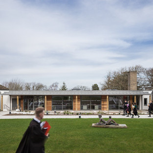 Двухэтажный блок с входом, туалетами и котельной на нижнем этаже включает в себя кафетерий на первом этаже, который примыкает к выходящему на южную сторону садовому павильону, обеспечивая большое взаимосвязанное социальное пространство как для неформальных, так и для официальных мероприятий. Здание является частью неформальных маршрутов перемещения, переплетающихся между зданиями кампуса и проходящих через них. Вход на нижнем уровне ведет к жилой лестнице, поднимающейся в социальное пространство на первом этаже и выходящей в окруженный стеной сад и связанные с ним пешеходные маршруты.